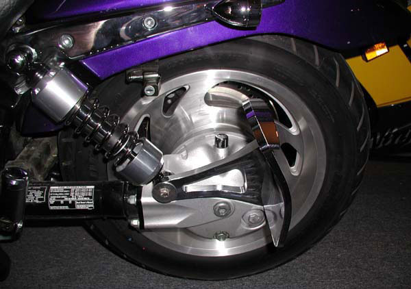 I just installed a side mount plate on my 2002 VTX 1800R, I see you mounted it to the shock mount. I tapped a 9/16 bolt threads through my axle bolt, we tapped enough to run a 2.50″ bolt. This looks just as awesome as yours and it sits farther back then yours, the only difficult thing I have encountered is finding a 9/16″ chrome or stainless bolt, not very common size and the bolts seem to be all zinc coated.