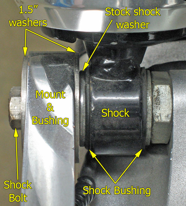 After getting the plate into the mount it became more trial and error. The unit itself is designed to mount on HD axle bolts, so the mount hole is 1″ across. The unit comes with a 3/4″ bushing but even with this my lower shock bolt would easily fall through the 3/4″ hole. I needed to come up with a way to fill in all the extra space around the bolt. This is where I owe SilverVTX as he was kind enough to machine a new bushing and mail it to me. For anyone trying to do this themselves, the image here (to the right) should give you an idea of what you’ll need.