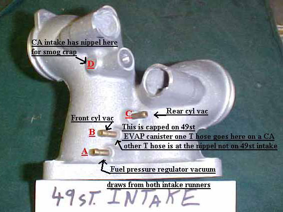 The picture to the left is a 49 state intake from a VTX 1800. I put a mark on the picture (D) where there is another brass nipple on the CA intake that is not found on the 49st intake.