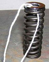 If you don’t have a friend available to offer an extra set of hands for this part, you can accomplish this task by yourself with a little ingenuity. Tie a string around the bottom of the coat hanger “U” and make a loop big enough to go around your foot. Make sure the string is shorter than the distance to the floor so you can stand on the string to pull the spring collar down leaving you with a free hand to remove the spring seat stopper. While this may not be a difficult task right now, you will absolutely need at least 3 hands during reassembly – so keep this in mind.