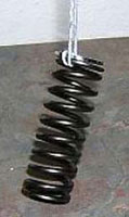 With the spring seat stopper completely removed, you can let the damper rod and lock nut fall down into the forks. Grab a shop towel to prevent any mess because as you slowly remove the spring collar and lift it out it will drip fork oil (see picture to left). If you remove it slowly enough, you will be able to let most of the fork oil drain back into the fork. Be especially careful when you get the spring collar almost completely out of the fork – there is a flare at the bottom that drags some fork oil up and it can make a big mess. Now bend the coat hanger straight and put a small hook in the end of it. Use the coat hanger to “fish” all the way to the bottom of the fork and pull the spring out (see picture to right). Drag it out slowly as well to let most of the fork oil drain off. |