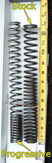 The stock springs give you about 4″ of exposed fork tube while the Progressive VTX springs push the front end up to show about 5″, and the Goldwing springs go all the way up to 5.5″. The fact that a shorter spring raises the front end by an inch should give you an idea of how much stiffer these new springs really are. The performance gains from either set of Progressive springs are comparable. Most guys go with the VTX version because of the price. The Goldwing springs are an additional $25-$30 for the set and most people aren’t willing to pay that much more for just an extra 1/2″ of clearance. If you really hit the curves a lot and drag pegs all day long, then maybe the extra bucks are well spent – it’s your decision to make.