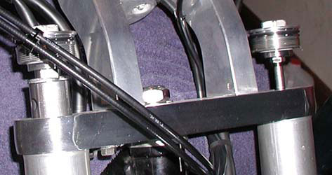 You have now finished changing both fork springs. Get a drop of clean fork oil on your finger and rub it around the O-rings on both fork caps. The service manual says to replace these O-rings with new ones, but they should not need to be replaced. Inspect your O-rings for nicks or tears and as long as they are intact you should be just fine reusing them. Lower the front tire so that both fork caps bottom out on the fork tubes like this: