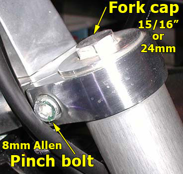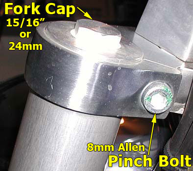 With all that done we are ready to break the top pinch bolts loose using an 8mm allen socket. With these loose you then break the fork caps loose using either a 15/16″ or 24mm socket. As you loosen the fork caps it is easiest if you alternate between them by doing a few turns on one and then a few turns on the other until you can feel that the threads are disengaged. Since the weight of the front wheel is hanging the fork caps will not pop up when they are loose, but you can tell the threads have disengaged when you begin hearing a “click” as you loosen them.
