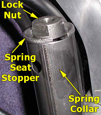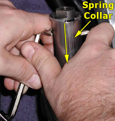 Continue backtracking your steps by reinstalling the spring collar, this is where that extra set of hands REALLY comes in handy as you try to do 3 things at once. Use the coat hanger to “fish” the damper rod and lock nut up and out of the fork, press the spring collar down the same way you did before and slip the spring seat stopper back into place. It’ll be a little tougher this time with the new springs in place, but it’s not too bad. At this point, you should look like the picture on the left below.