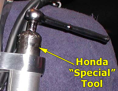 Now you need to lower the front wheel back down. Remove whatever you used to block the wheel and let the front tire extend down until the right fork cap hits the top of the fork tube. Slip the Honda “special” tool over the rebound rod assembly and lock it into the nut at the bottom.