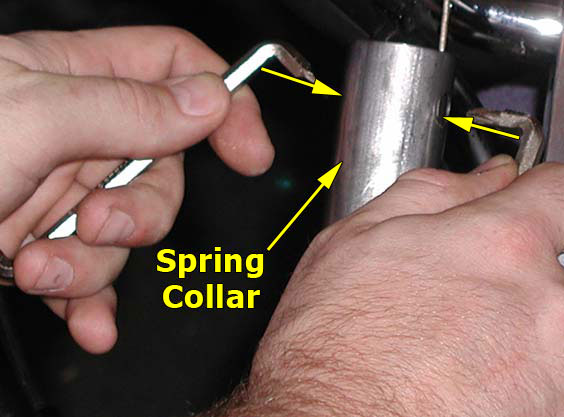 So again, hook whatever you’re using in the holes in the spring collar and pull down. While doing this, remove the spring seat stopper.